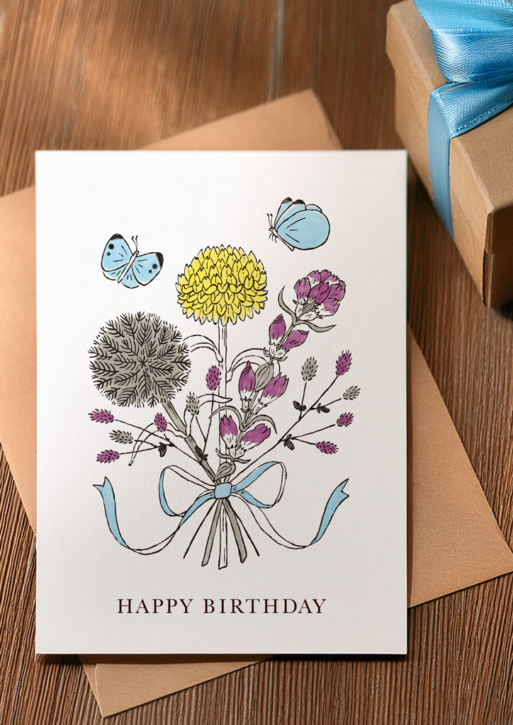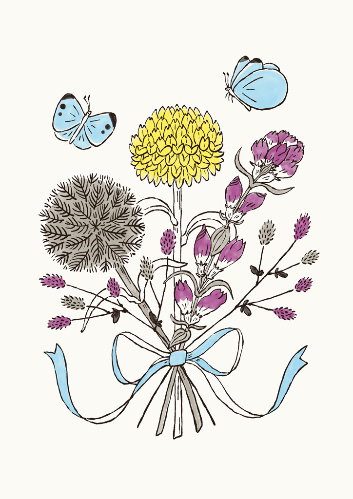 それぞれの花がきれいに見えるように構成し、繊細な花のフォルムを線画で表現しました。