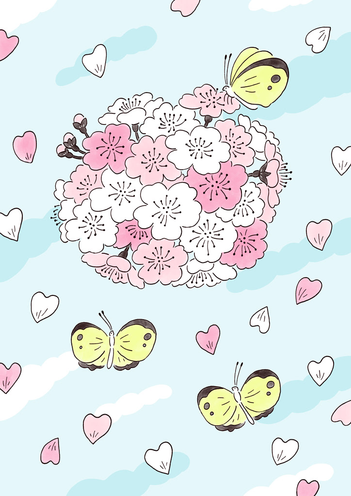 桜を円形に構成し、そのまわりに散る桜の花びらと舞う蝶。