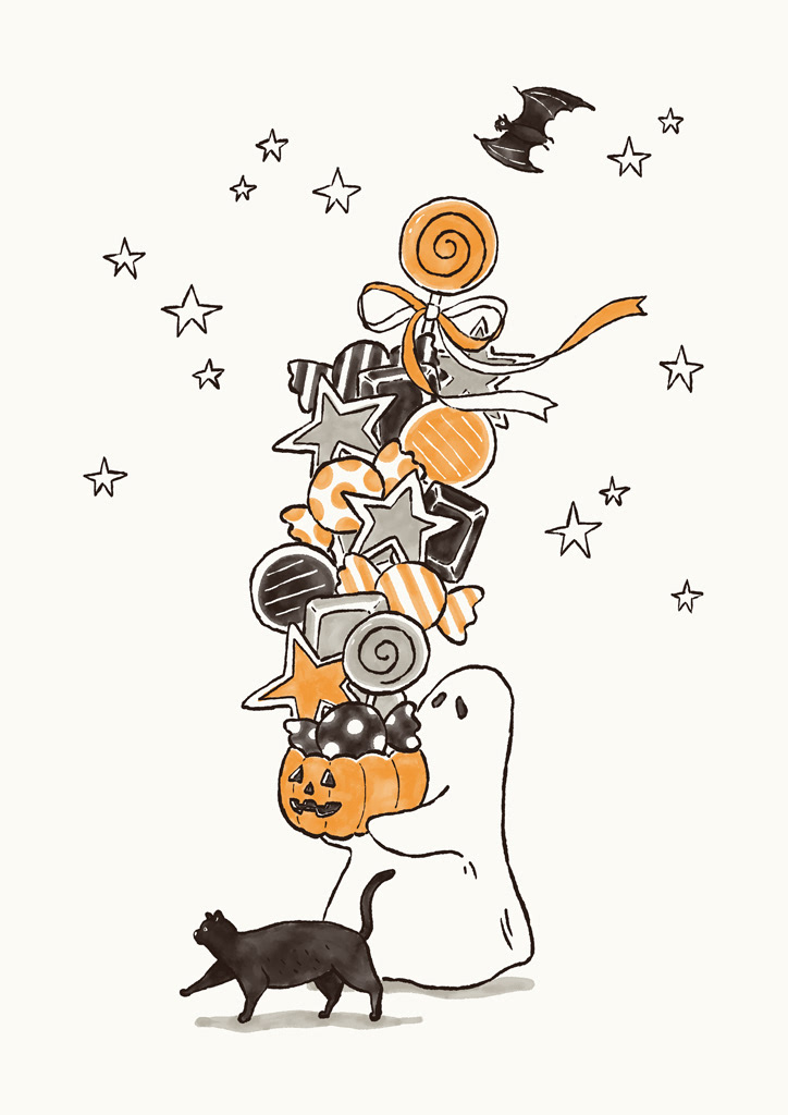 オバケが黒猫とこうもりを連れて、たくさんのお菓子をもらう様子です。